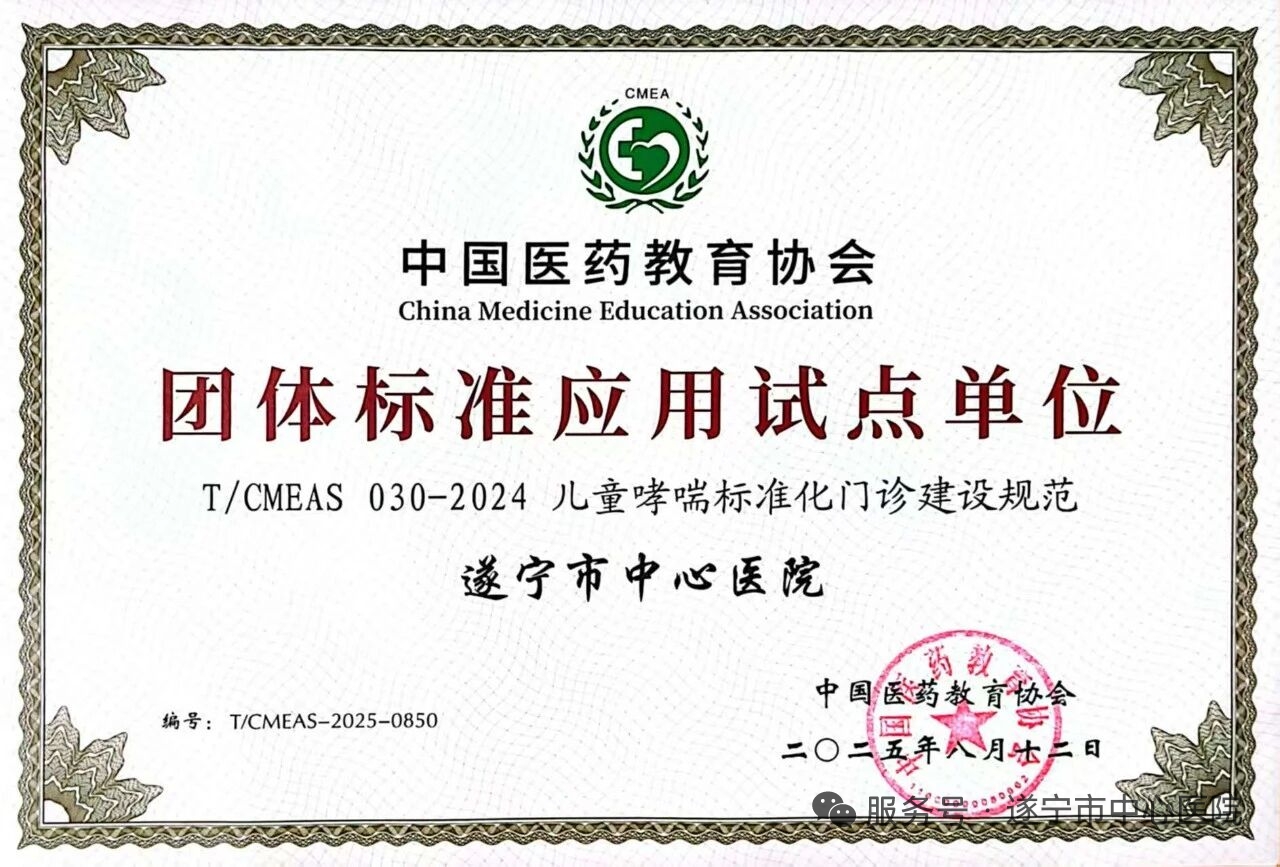 近日,中国医药教育协会公布全国第三批“儿童哮喘标准化门诊建设规范”试点单位名单,遂宁市中心医院儿科成功入选。这是自2018年首次入选后再次获此殊荣,标志着我院儿科在儿童哮喘领域的诊疗水平和服务能力持续居于全国先进行列,将为区域内哮喘患儿提供更专业、规范、系统的医疗服务。