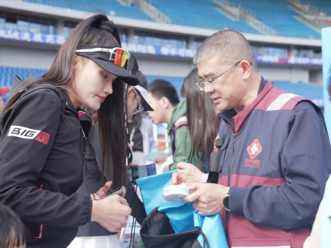 另一边的健康打卡区更显热闹:志愿者们热情邀请跑友扫码关注遂宁疾控新媒体账号,同步发放科普折页、运动背包、洗漱包等宣传品,其中体重指数腰围尺尤其受欢迎,不少跑友当场对照说明测量,实时了解自身健康状况。“这个尺子太实用了,平时自己都没留意过腰围标准!”一位跑友边测边说道。
