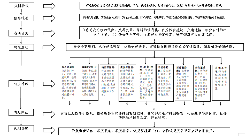 (3)灾中研判机制。较大及以上灾害发生后,市应急委办公室(市应急局)组织相关成员单位和县(市、区)、市直园区分析研判灾情,了解应对处置情况,研究部署应对处置工作;一般灾害发生后,县(市、区)、市直园区应急委办公室(应急部门)组织相关成员单位和乡镇(街道)分析研判灾情,了解应对处置情况,研究部署应对处置工作。