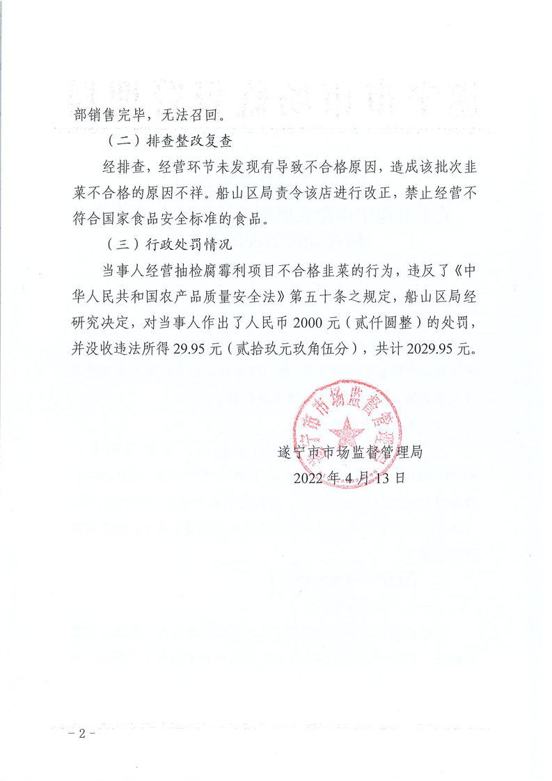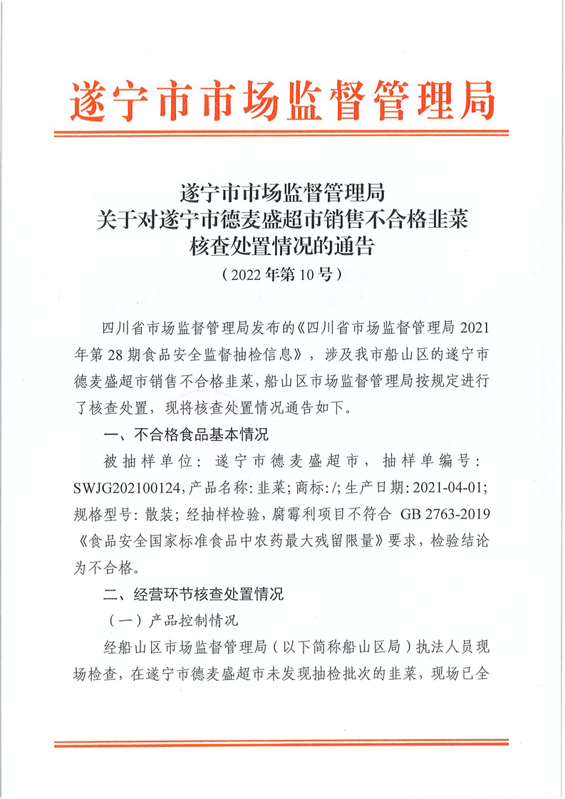 遂宁市市场监督管理局关于对遂宁市德麦盛超市销售不合格韭菜核查处置情况通告(2022年第10号)