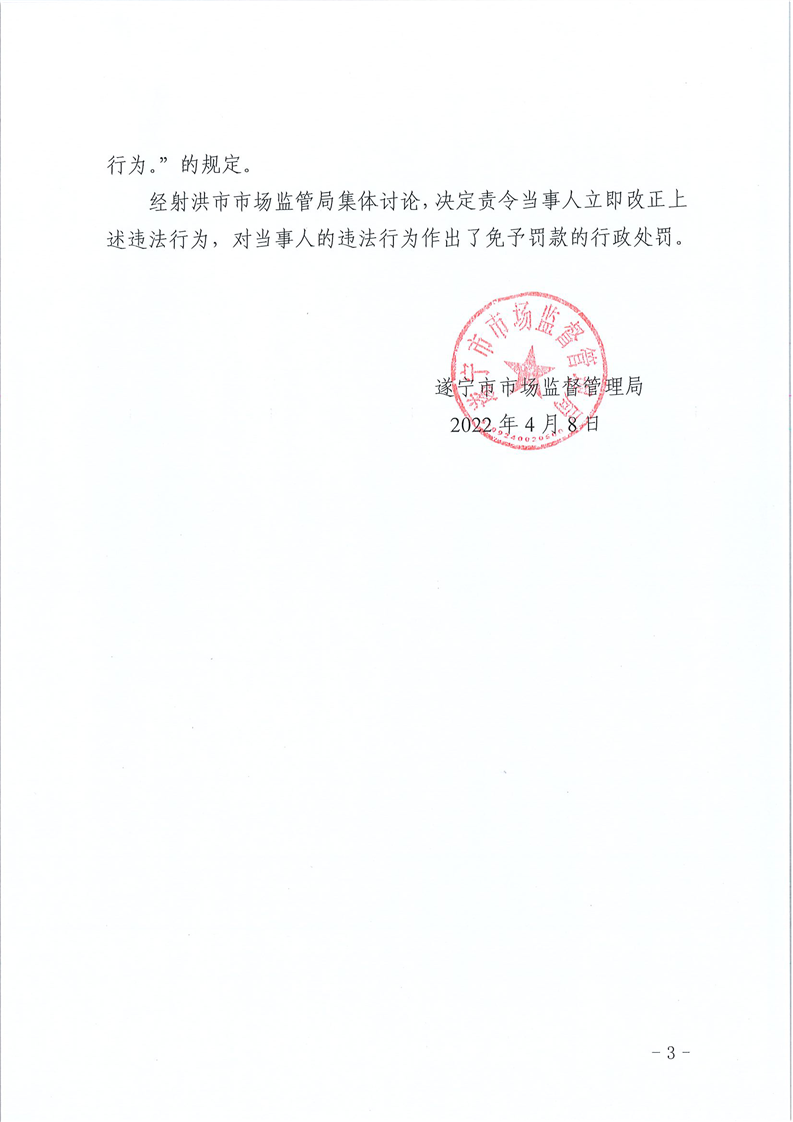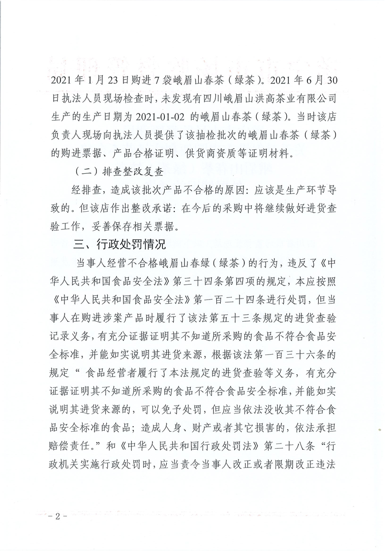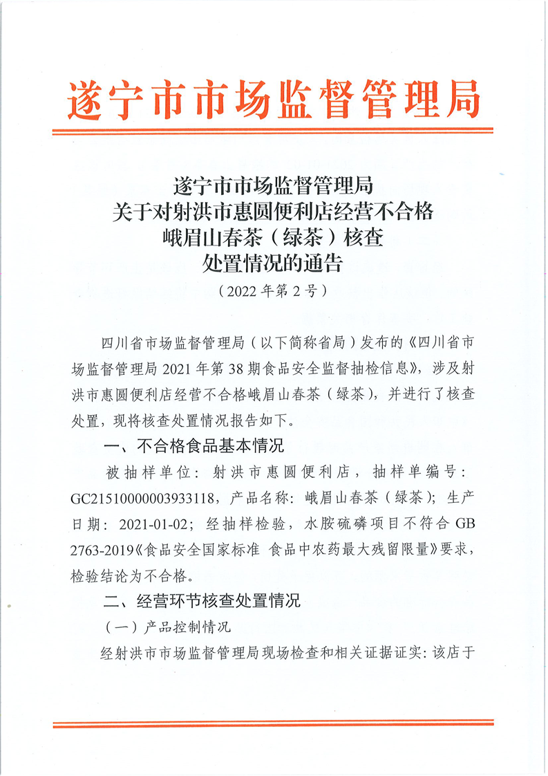 关于对射洪市慧圆便利店经营不合格峨眉山春茶(绿茶)核查处置情况的通告(2022年第2号)