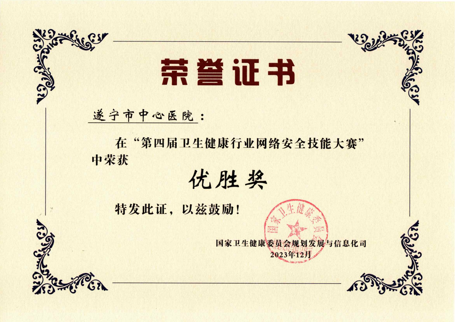 12月5日,由国家卫生健康委主办、中国医院协会承办的第四届全国卫生健康行业网络安全技能大赛在长沙收官,来自全国31个省(自治区、直辖市)和新疆生产建设兵团共计121支队伍、463名选手参加比赛。经过理论比拼和数据分析+实景防御6小时18轮次的持续测试评估,遂宁市中心医院信息中心团队(顾宇峰,唐夏,杨强,胡韬,李昊昱)获得大赛优胜奖,顾宇峰获得杰出领队奖。