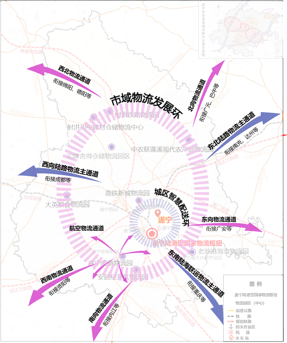 统筹遂宁市物流业发展基础条件和未来发展需要,构建高效服务成渝地区双城经济圈建设、辐射国内国际的“三主六辅”物流通道网络。完善以遂宁陆港型国家物流枢纽为核心,区域物流设施、城乡配送网点为支撑的多层级现代物流枢纽设施系统,形成“一核两环多点”市域物流空间布局。衔接畅通物流通道,强化枢纽服务功能,创新物流组织模式,打造通道畅通、枢纽引领、网络辐射的“通道+枢纽+网络”发展格局。