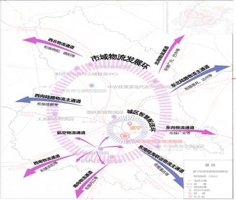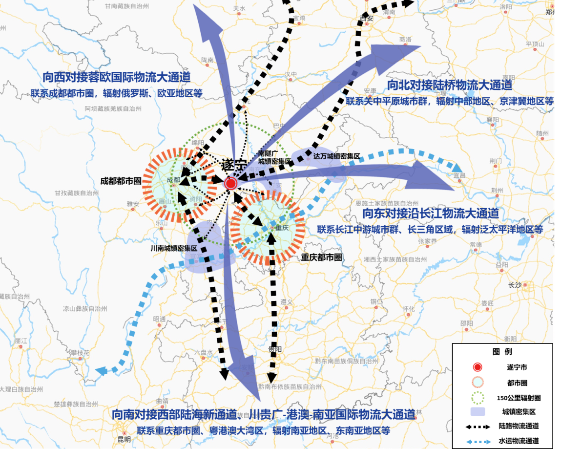 畅通区域融合的国内物流大通道。以成渝地区双城经济圈的总体辐射方向为通道建设依托,创新对接成渝的通道发展模式,补齐交通基础设施短板,畅通以遂宁三大主通道为核心联通国内的物流通道网络,推动遂宁全面融入国家物流网络运行。着力发挥遂宁中原方向开展通道运输的区位优势,围绕襄阳、郑州、西安等方向,对接陆桥物流大通道,推动铁路通道化运行;加快衔接成渝,融入西部陆海新通道运行,推进联系贵阳、南宁、钦北防等方向的铁路、多式联运通道服务发展;积极对接沿长江物流大通道,密切与武汉、南京等地通道化联系。