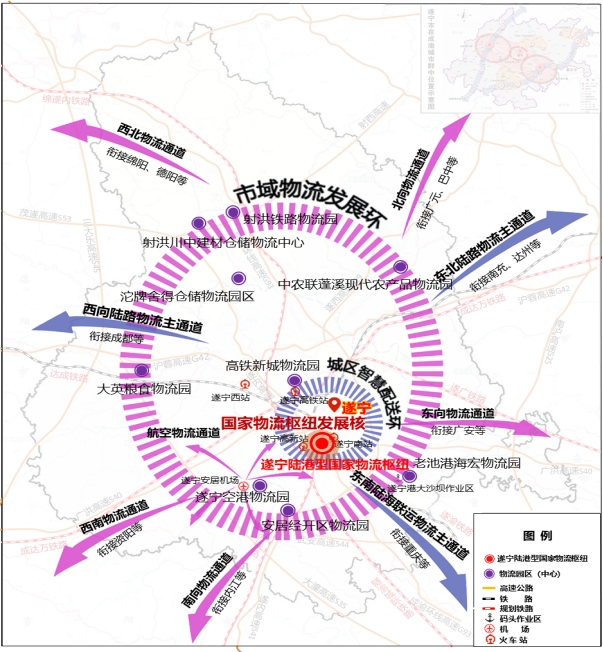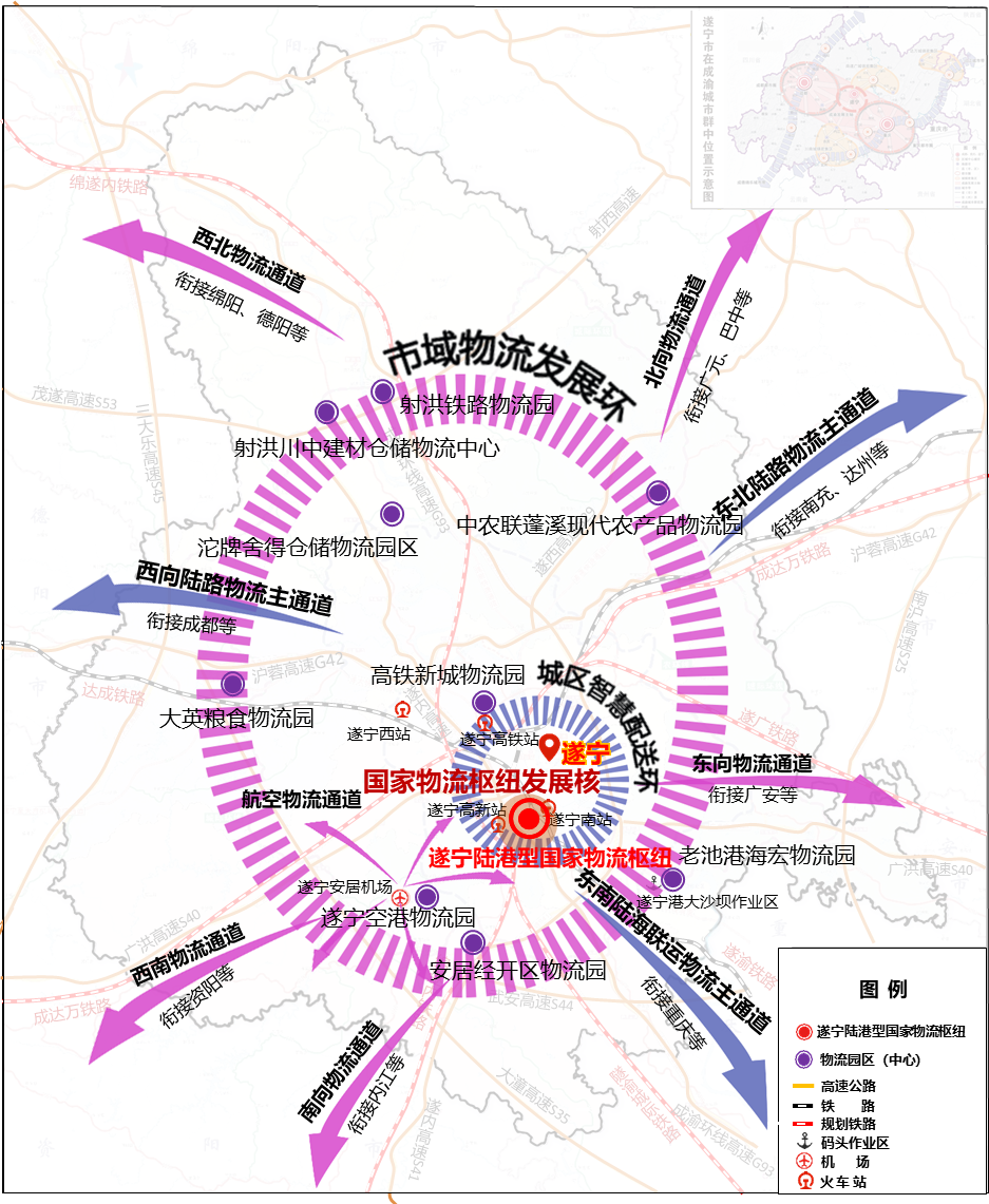 东南陆海联运物流主通道。通过遂渝铁路、成渝环线高速(G93)、涪江遂宁老池至重庆合川段,向东南密切与重庆市联系,并进一步向东延伸至宜昌、武汉,向南延伸至贵州、南宁、北部湾,对接沿长江物流大通道、西部陆海新通道等,构建通江达海陆海国际联运物流通道网络。
