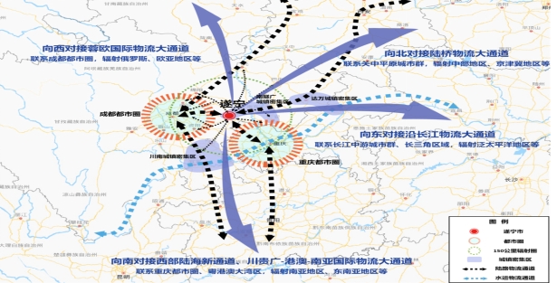 西向陆路物流主通道。以达成铁路、沪蓉高速(G42)为核心,茂遂高速(S53)、广洪高速(S40)为补充,向西密切与成都通道联系,并进一步向北延伸至兰州,向南延伸至宜宾、百色、北部湾,对接中欧班列、西部陆海新通道(西线)等国际国内大通道。