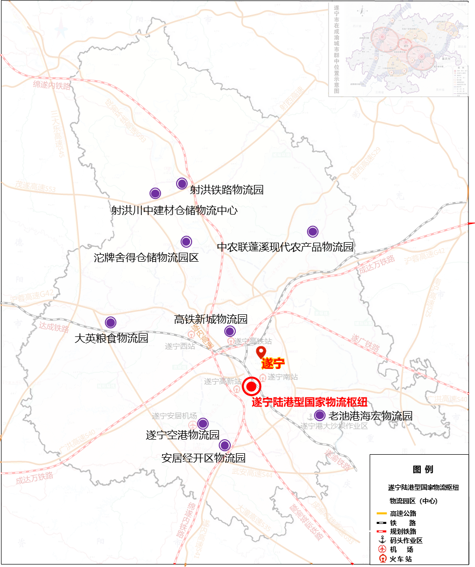 侧重生产服务功能的物流园区(中心),重点提升大宗工业原材料、工业品仓配设施能力,加快完善相关铁路、公路场站设施条件,促进运输和供应链服务企业聚集,提高服务区域制造业的能力和水平。侧重商贸服务功能的物流园区(中心),重点强化粮食、农产品、生活用品等各类专业仓储能力建设,兼顾有关物资的应急储备设施能力补充,完善配套的公路网络化运输、配送服务场站设施条件。加快遂宁安居机场及空港物流园建设。