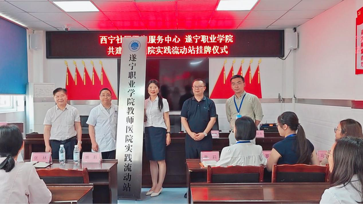 5月8日,遂宁高新区西宁社区卫生服务中心与遂宁职业学院共建教师医院实践流动站挂牌仪式在西宁社区卫生服务中心举行。遂宁高新区社事群工局、遂宁职业学院和西宁社区卫生服务中心相关负责人及职工代表参加挂牌仪式。