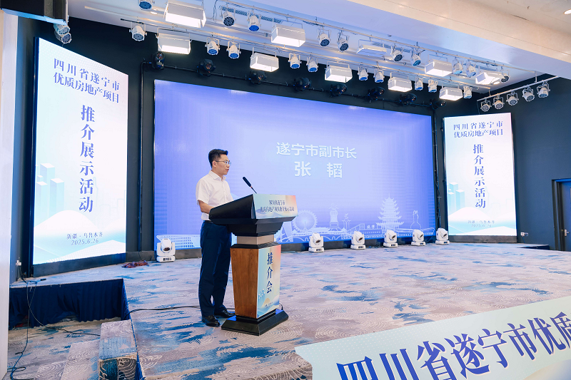 为了广泛宣传展示遂宁市城市形象和优质房地产项目,更好满足购房者多元化和改善性住房需求,2025年6月26日下午,由遂宁市住房和城乡建设局主办的“遂宁市优质房地产项目推介展示活动”在新疆乌鲁木齐市吐哈石油大厦天山厅顺利召开。遂宁市政府副市长张韬、副秘书长胡建军,市住房城乡建设局党组书记、局长邓勇等出席活动。参加本次活动的嘉宾有乌鲁木齐市遂宁商会、重庆商会、四川总商会联合会、新疆生产建设兵团川渝商会等各大商会的会长以及川渝企业家代表、遂宁市在乌鲁木齐市经商务工人员、乌鲁木齐市市民等210余人。