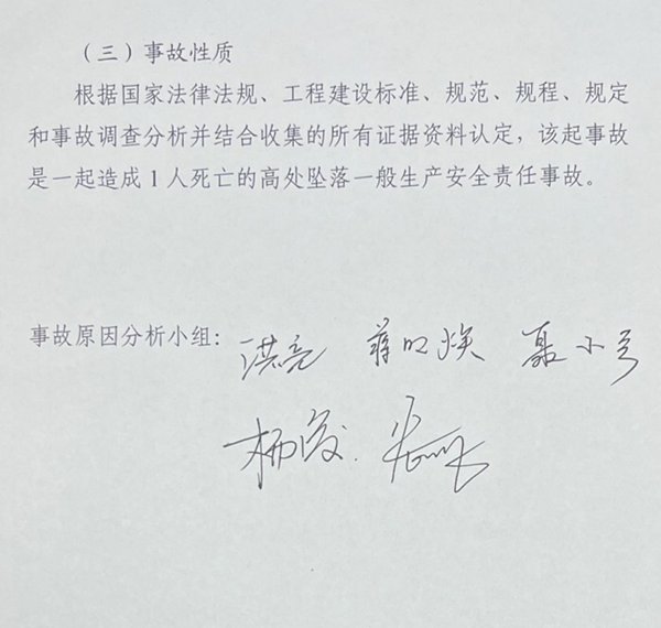 二、同意《成都建工第五建筑工程有限公司“2·19”高处坠落一般生产安全事故调查报告》(以下简称《事故调查报告》)对事故原因及事故性质的分析和认定。