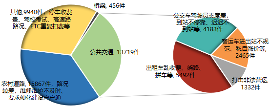 (四)交通运输39982件。主要反映两类问题,一是路面受损、路况差等道路问题15867件,占39.69%;二是出租车、公交车违规经营等公共交通类来电13719件,占34.31%。