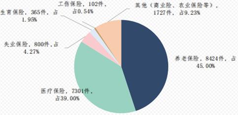 (九)社会保险18719件。一是社会保险政策咨询;二是城乡居民医疗保险参保信息未及时录入系统,导致报销延迟,退休金未按时发放;三是个别用人单位不按规定缴纳社会保险;四是土地被征用,要求享受失地农民购买社会养老保险待遇。