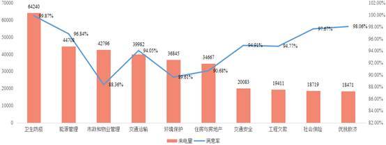 十大热点问题合计33.99万件,占有效来电的58.51%。其中,卫生防疫来电增长最多,同比增长6.27万件;优抚救济问题来电下降最多,同比下降19.57%。群众满意度最高的是卫生防疫,最低的是市政和物业管理,其次是环境保护。
