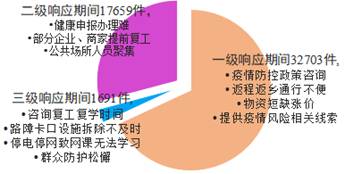 (一)卫生防疫64240件。“新冠肺炎疫情”成为年度第一热词,相关来电量显著增加,主要集中在突发公共卫生事件应急响应期间,从疫情暴发初期的“咨询疫情防控相关政策”“口罩难买”“提供疫情风险隐患线索”,到三级响应期间的“加强防控措施,增加消杀防护”“复工复产复学咨询”等方面,12345热线均将相关来电作为急件办理,咨询类问题通过查询系统知识库当场办结,其他问题10分钟内交办至责任单位,并实时跟踪督办。