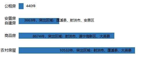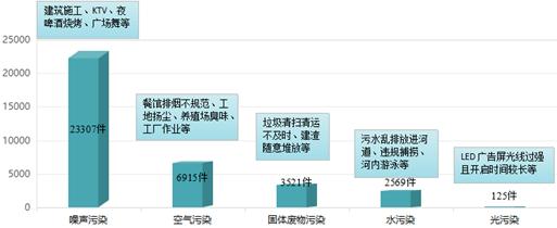(五)环境保护36845件。从来电区域看,射洪市最多8328件;从诉求内容看,噪音污染一直是群众反映强烈的问题,全年受理23307件,占63.26%;从来电时段看,主要集中在5—9月。噪音污染船山区最多5509件,滨江路片区、天宫路KTV、烧烤等营业场所较突出。