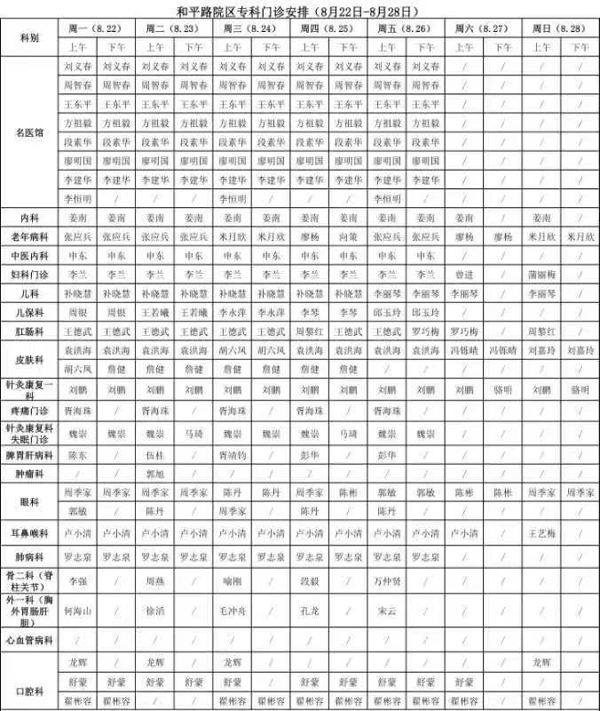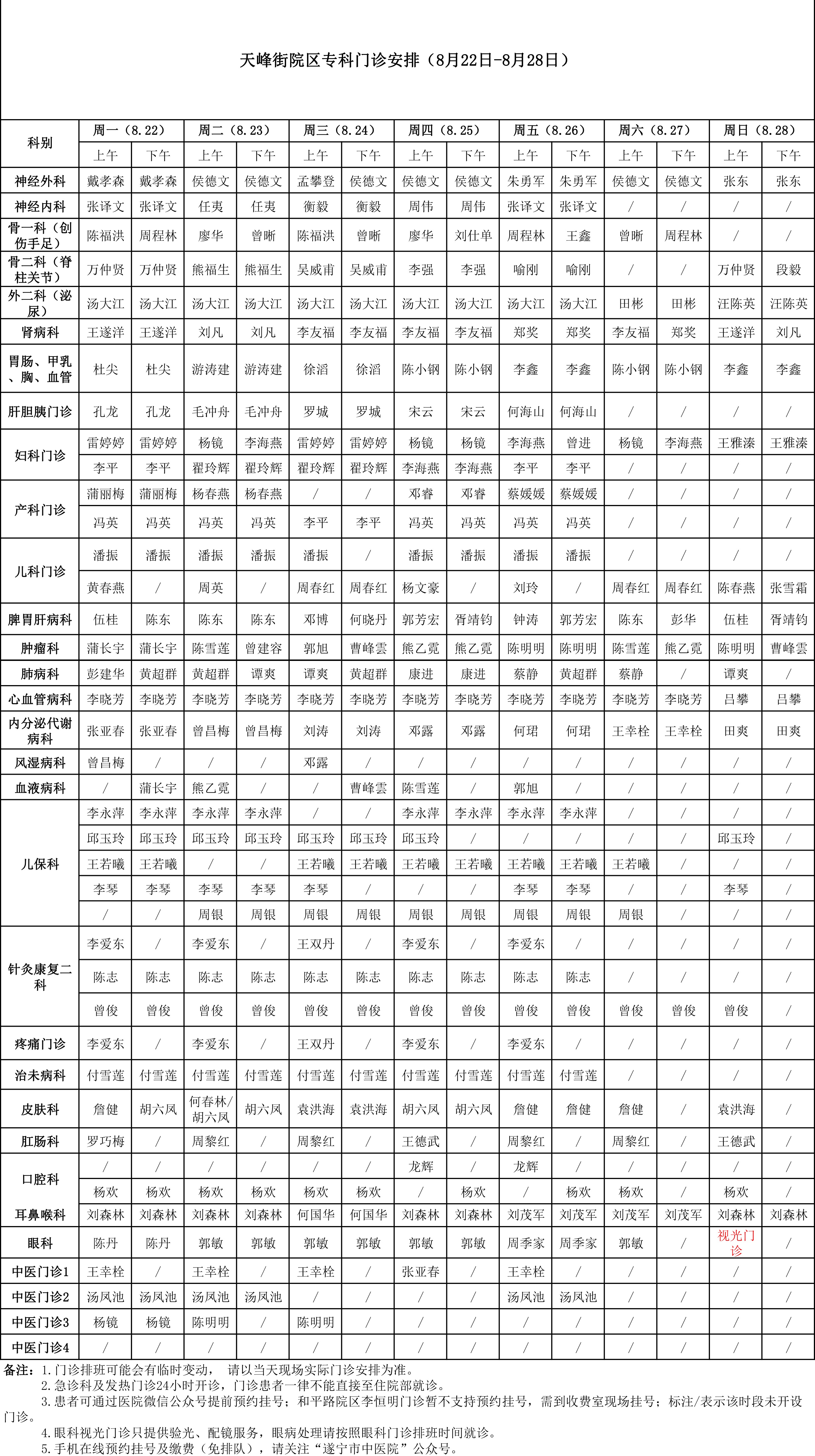 遂宁市中医院专科门诊安排(8.22——8.28)