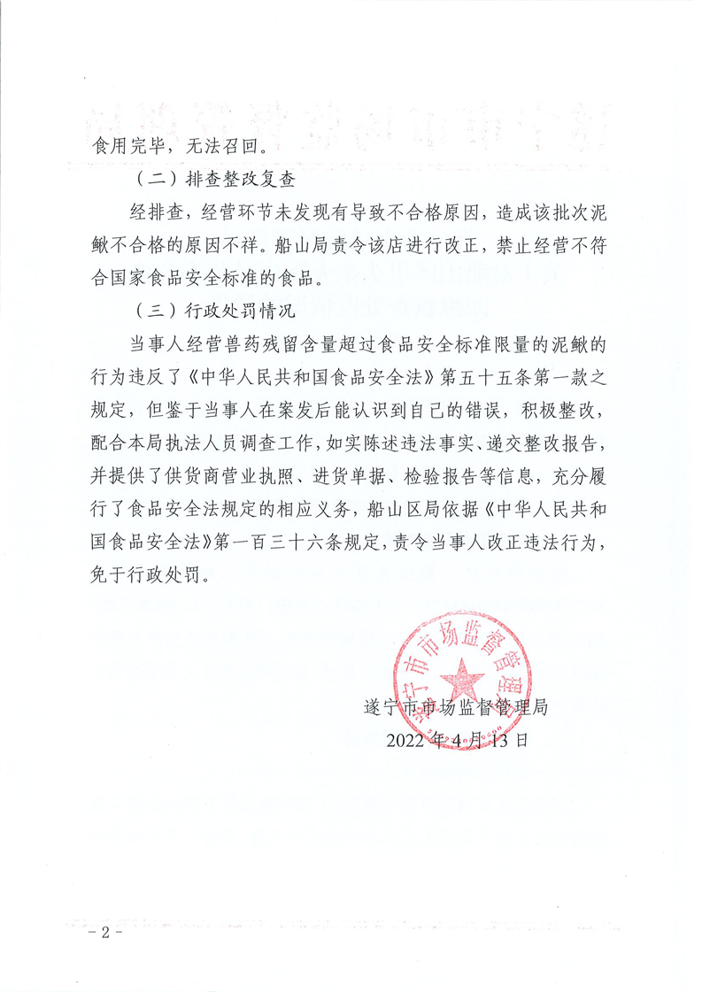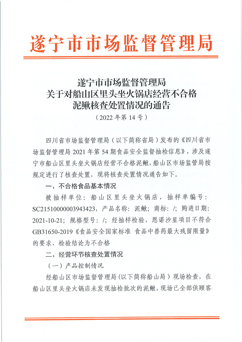 遂宁市市场监督管理局关于对船山区里头坐火锅店经营不合格泥鳅核查处置通告(2022年第14号)