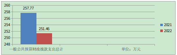 2022年一般公共预算财政拨款支出251.46万元,占本年支出合计的100%。与2021年相比,一般公共预算财政拨款支出减少6.31万元,下降2.45%。主要变动原因是本年度厉行节约,未购买公务用车,相关开支减少。