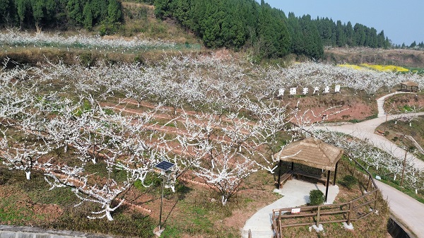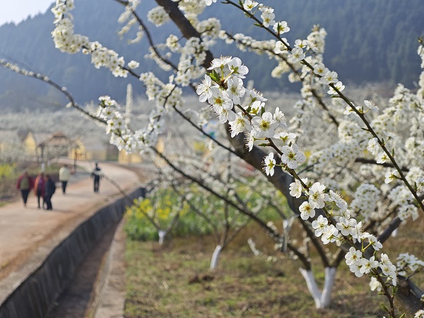 据了解,2023年底,唐家乡坚持生态优先、绿色发展理念,通过招商引资建成贡硒源农产品生产基地,利用撂荒地、闲置土地、低产值土地进行连片打造,统一设计、统一管理,大力发展特色农产品贡硒李。如今,贡硒李产业园规模初显,园区2万株贡硒李正式进入花期,漫山遍野的李花竞相绽放,整个园区“银装素裹”,勾勒出一幅美丽的山水田园画,让人如痴如醉。