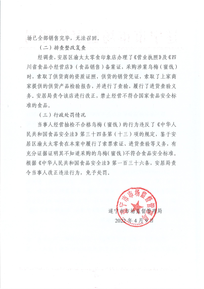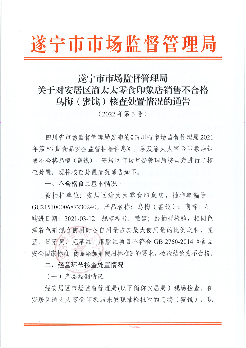 遂宁市市场监督管理局关于对安居渝太太零食印象店销售不合格乌梅(蜜饯)核查处置情况的通告(2022年第3号)