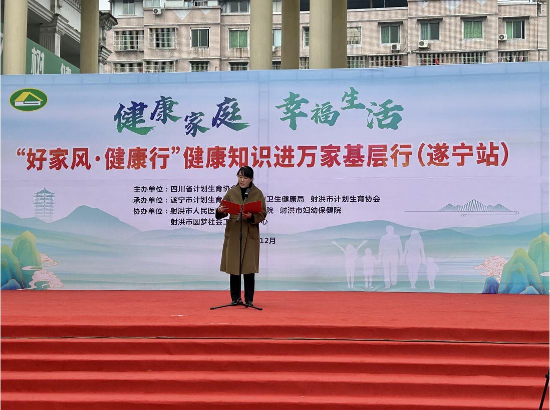 12月19日,“好家风 健康行”健康知识进万家基层行(遂宁站)——“健康家庭 幸福生活”活动在遂宁市射洪市成功举办。省计生协家庭服务部部长李臻出席活动并致辞,市卫生健康委副主任刘力铖,射洪市副市长于开等领导出席活动。