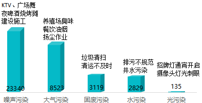 (五)环境保护38026件。从来电问题看,噪声污染投诉最多,占61.38%;大气污染次之,占22.41%;光污染相对最少占0.36%。从来电区域看,射洪市最多7915件,遂宁高新区最少1271件;从来电时段看,主要集中在4—6月。噪声投诉遂宁经开区、船山区最多分别达5650件、5100件,在建工地、店面经营、广场舞麻将馆等噪声较突出。