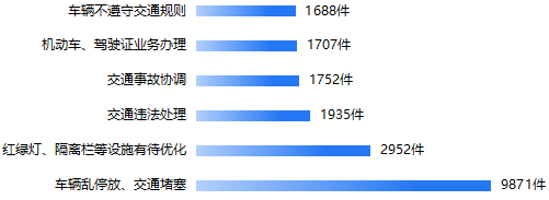 (十)交通安全21672件。同比增长15%,车辆乱停放、随意掉头、变道、不礼让行人、城市道路交通堵塞等问题凸显,以及群众对红绿灯优化、道路隔离栏和停车位增设等提出意见建议。