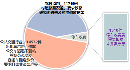 (六)交通运输35416件。同比下降11.42%,一是出租车、公交车等公共交通行业服务质效有待提升,客运车辆监管有待加强;二是农村道路建设、维护不及时;三是停车收费贵、重复扣费等。