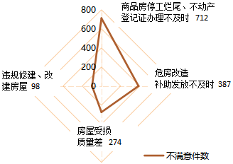 (三)住房与房地产46896件。同比增长35.28%,群众满意率77.82%,为十大热点问题最低。主要反映商品房停工烂尾、不动产登记证办理不及时、农村危房改造及补助发放不及时、违规改建房屋等问题处理不及时。