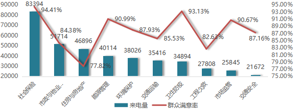 年度十大热点问题合计40.58万件,占有效来电的55.88%。其中,社会保险类来电增长最多,同比增长345%;卫生防疫类下降最多,同比下降45.68%。群众满意度最高的是社会保险类,最低的是住房与房地产和工程欠款类问题(见图7)。
