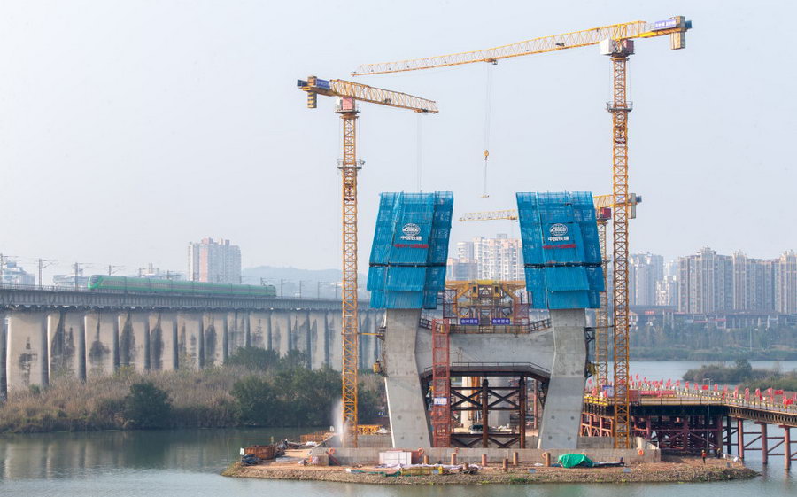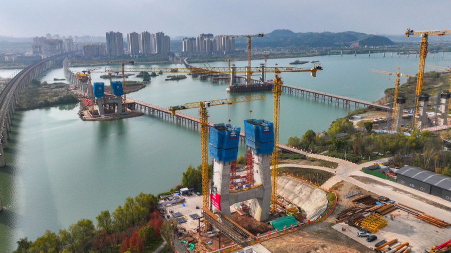 12月14日,位于成都至达州至万州高速铁路(简称“成达万高铁”)遂宁涪江特大桥建设现场,工人们正在对下横梁、悬灌梁等程序进行有序作业,加快完成年度目标建设。据了解,该桥梁全长5585.4米,全桥主要跨越涪江、渠河、中环路、芳州路、香林路、五彩缤纷路、新星路、渠河北路等道路。据悉,成达万高铁是我国“八纵八横”高铁网沿江通道的重要组成部分,正线全长477公里,设计时速350公里,也是过境遂宁的首条高速铁路。