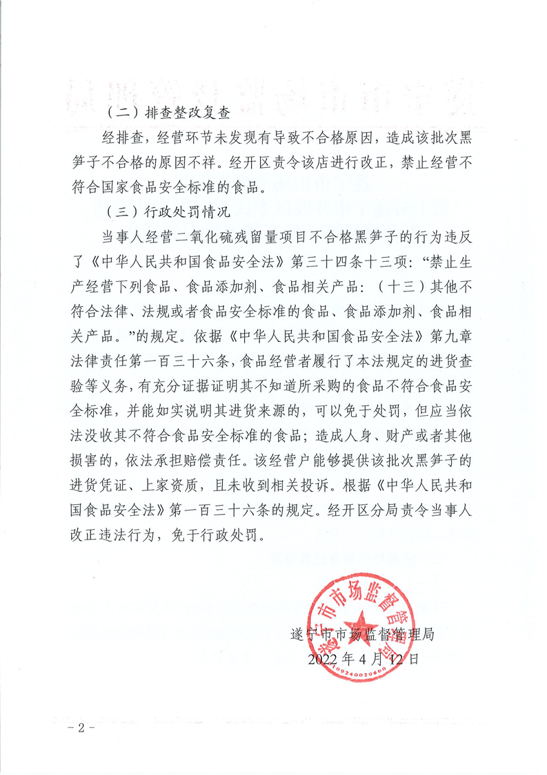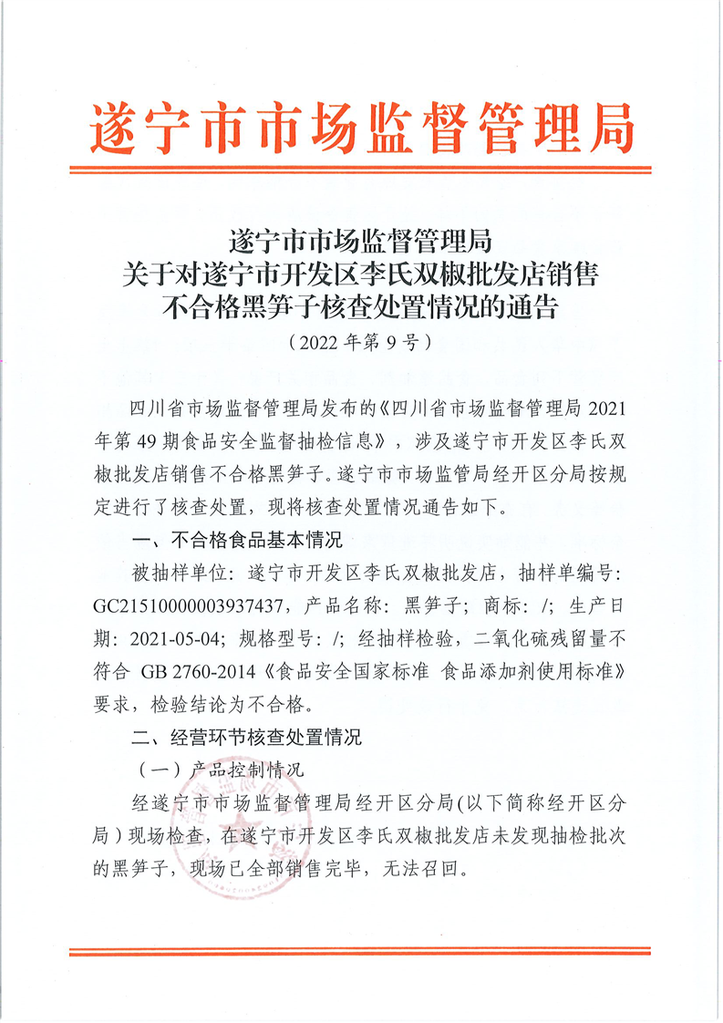 遂宁市市场监督管理局关于对遂宁市开发区李氏双椒批发店销售不合格黒笋子核查处置情况的通告(2022年第9号)