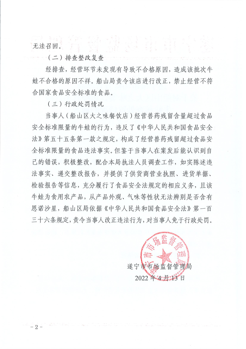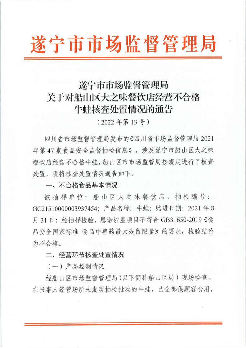 遂宁市市场监督管理局关于对船山区大之味餐饮店经营不合格牛蛙核查处置通告(2022年第13号)