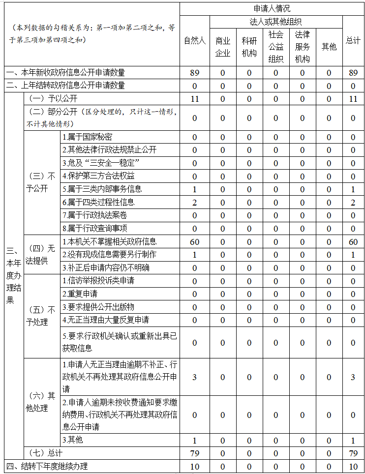 按照《中华人民共和国政府信息公开条例》和《政府信息依申请公开工作规范》要求,规范受理依申请公开89件,办结79件,结转下年度继续办理10件。未因依申请公开被行政复议或行政诉讼。