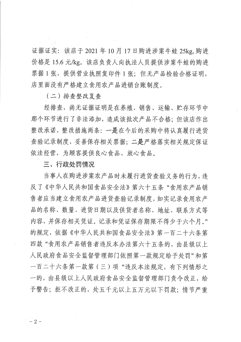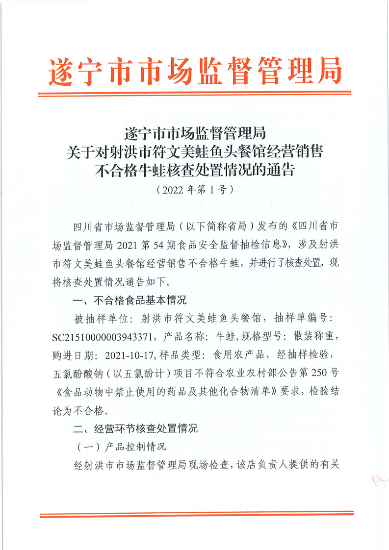 关于对射洪市符文美蛙鱼头餐馆经营销售不合格牛蛙核查处置情况的通告
