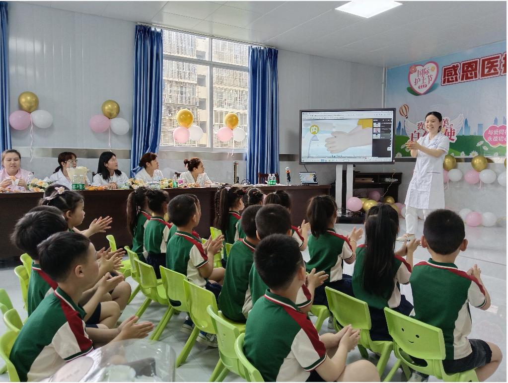 活动中,来自小神童幼儿园的一群可爱的小朋友们,在老师的组织带领下进行了舞蹈表演。随后,护士小姐姐向小朋友们详细介绍了常用的医疗器械,并进行了《七步洗手法》教学,让孩子们养成勤洗手的好习惯。表演结束后,孩子们把自己精心绘制的医护主题画送给了白衣天使们,让他们感受到了别样的温暖与关爱。