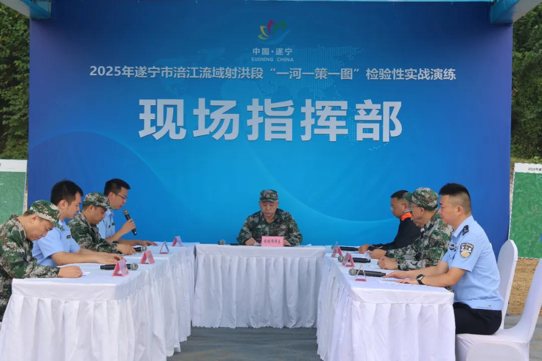 10月16日,由遂宁市人民政府主办,遂宁市生态环境局、遂宁市应急管理局、射洪市人民政府承办,多部门多单位参加的2025年遂宁市涪江流域射洪段“一河一策一图”检验性实战演练在射洪市圆满举行。