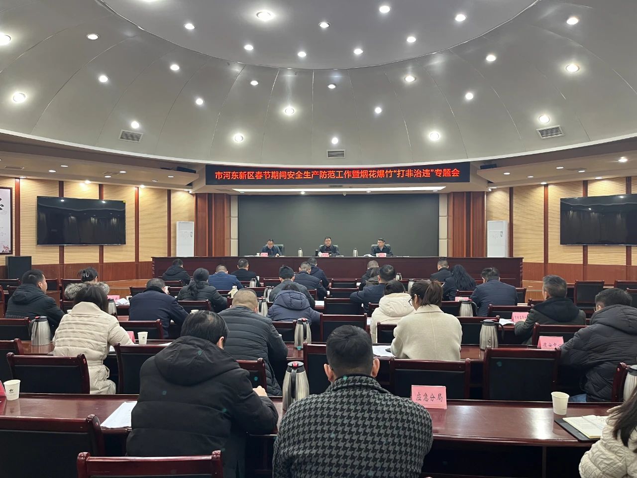 强化领导部署,压实工作责任。市河东新区组织召开专题工作会议,安排部署烟花爆竹专项整治工作。研究制定《市河东新区烟花爆竹旺季“打非治违”实施方案》,严厉打击非法生产经营烟花爆竹行为,全面排查烟花爆竹非法生产经营窝点,加大打击非法生产、非法经营、非法储存、非法运输的力度。