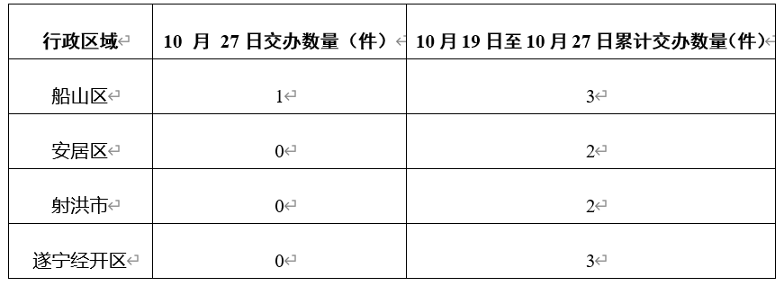 截至10月27日10时,中央第三生态环境保护督察组累计向我市转办群众信访举报件10件(来电举报4件,来信举报6件),其中重点关注1件。各地累计信访举报件为:船山区3件、安居区2件、射洪市2件、遂宁经开区3件。