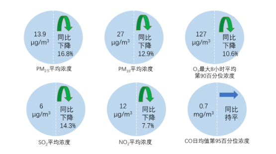 8月,全国339个地级及以上城市PM2.5平均浓度为13.9微克/立方米,同比下降16.8%;PM10平均浓度为27微克/立方米,同比下降12.9%;O3平均浓度为127微克/立方米,同比下降10.6%;SO2平均浓度为6微克/立方米,同比下降14.3%;NO2平均浓度为12微克/立方米,同比下降7.7%;CO平均浓度为0.7毫克/立方米,同比持平。