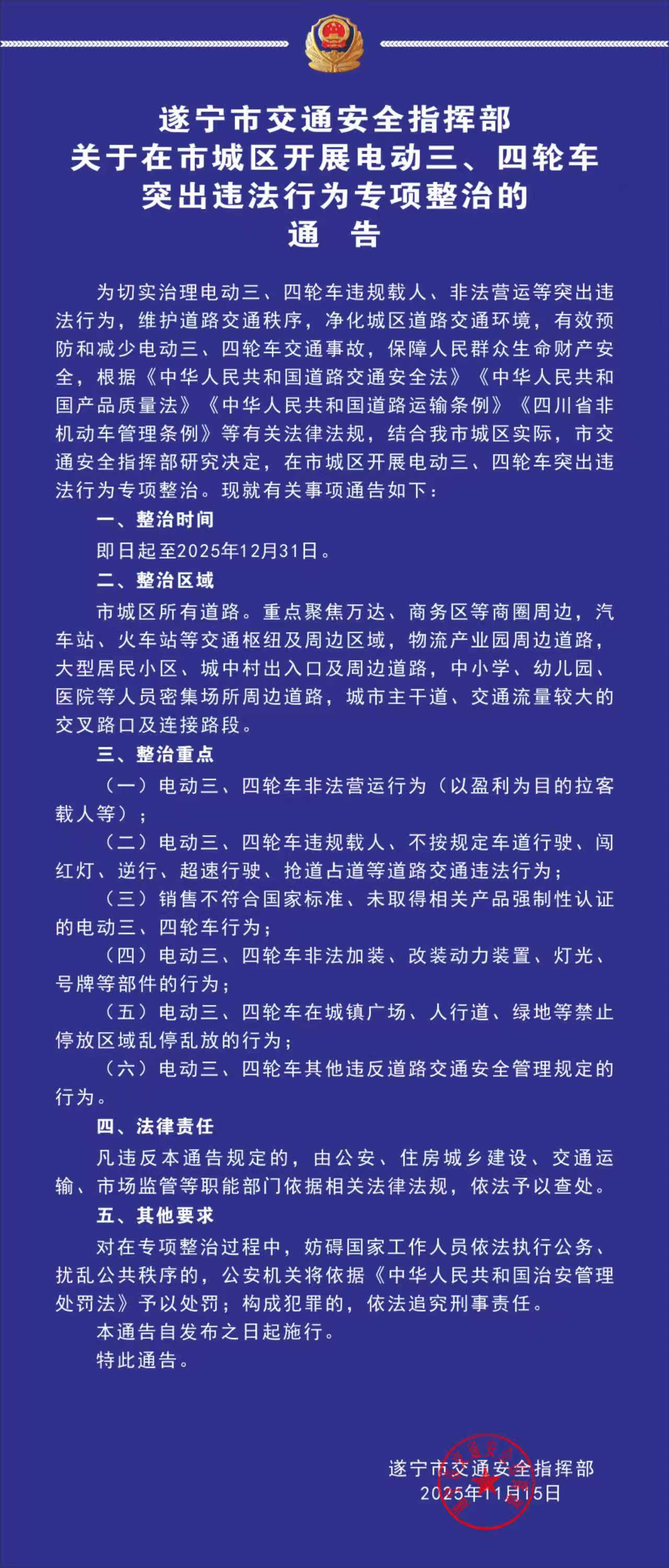 即日起!遂宁市城区将开展电动三、四轮车突出违法行为专项整治