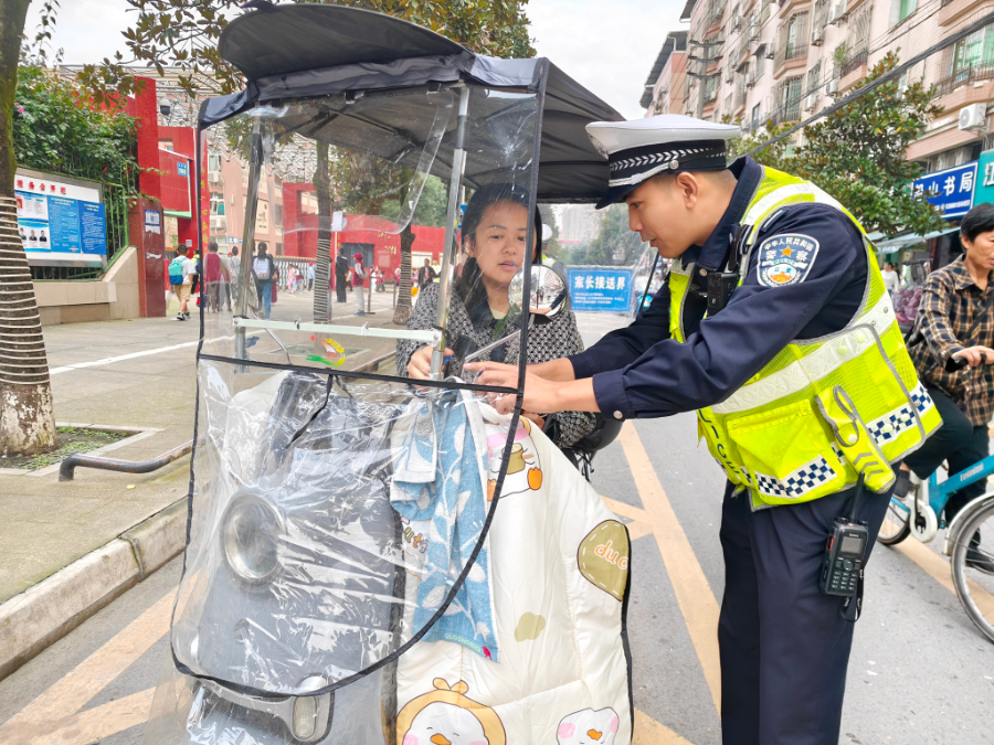 近日,在遂宁高级实验学校外国语学校外,市公安局交管支队直属一大队民辅警早早来到这里,对电动两轮车加装雨棚的违法行为开展集中宣传整治。随着上学时间临近,送孩子上学的家长增多,记者注意到,不少家长骑乘的电动两轮车均加装了雨棚、挡风被等,也因此被现场民辅警一一拦下,要求现场拆除违法加装的设施。