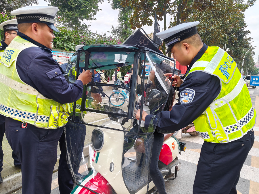 我市交管部门开展电动两轮车违法加装雨棚、机动车乱停乱放专项整治行动